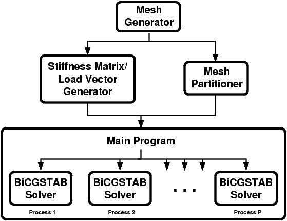 We have also begun coding the parallel version of BiCGSTAB. The actual algorithm is similar to the conjugate gradient method, so few modifications were needed for that part of the code. However, in order for our code to perform on arbitrary meshes, we must handle the structure of the stiffness matrix and the ghost nodes very carefully, which we are currently working on.